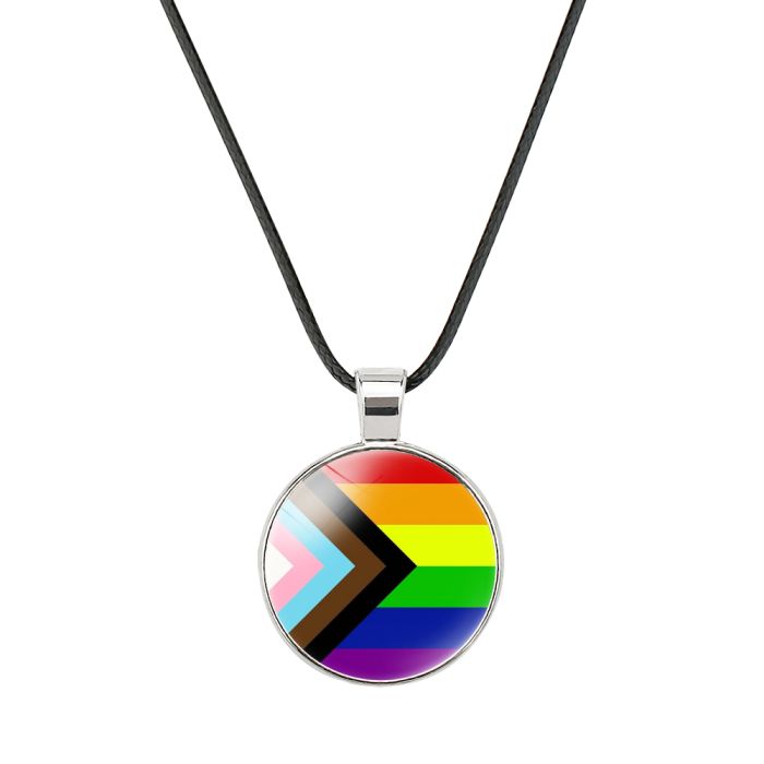 A cute pendant in the design of the progressive rainbow pride flag.